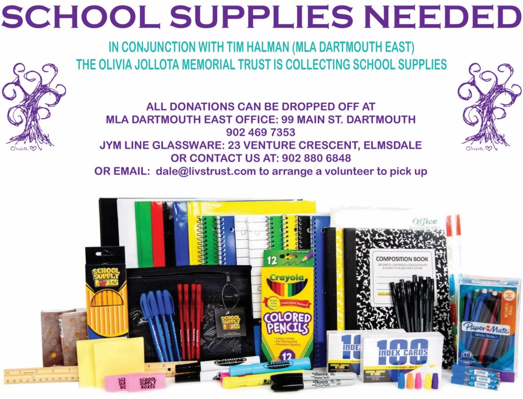 Once again we are partnering with Tim Halman’s office (MLA for Dartmouth East) to collect and distribute these much needed school supplies. Olivia’s Trust will be buying items that are most needed and sought after to fill any gaps in the donations.